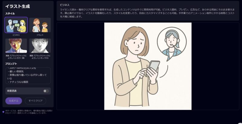 また、イラスト生成では同じテイストの素材を複数そろえられるため、デザインの統一感を出したい案件にも非常に使いやすいと感じました。商用利用OKという点も、クリエイターにとって安心材料のひとつです。